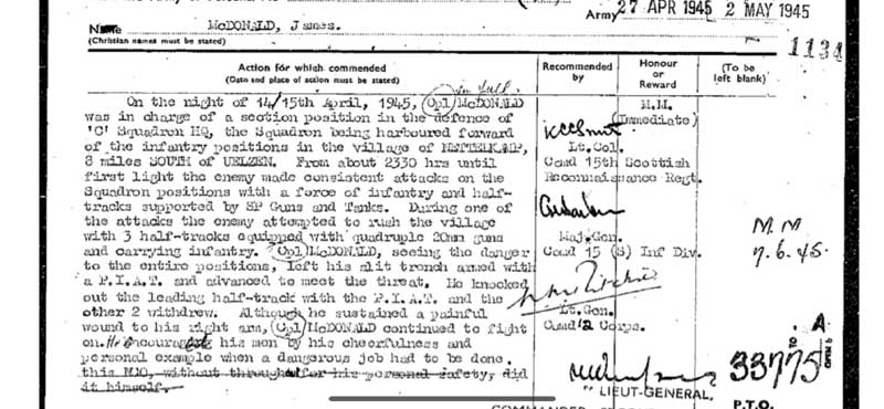 On the night 14/15 April 1945, when 'C' Squadron, The 15th Scottish Reconnaissance Regiment were harboured for the night in Nettelkamp, 3? miles SOUTH of UELZEN, Sqn. Sgt Major WARD (WO II) accompanied his Squadron Leader around the defences of Squadron HQ. At approximately 23.30 hrs a fierce enemy counter-attack developed against the Squadron as a whole, commencing with the forward troops. On attempting to reach the forward positions, the Squadron Leader with Sqn. Sergeant Major WARD were held up by enemy spandau [Maxim LMG 08/15 machine gun which had a theoretical cyclic firing rate of 500 7.92mm rounds per minute?] fire covering the exits to the Squadron HQ.